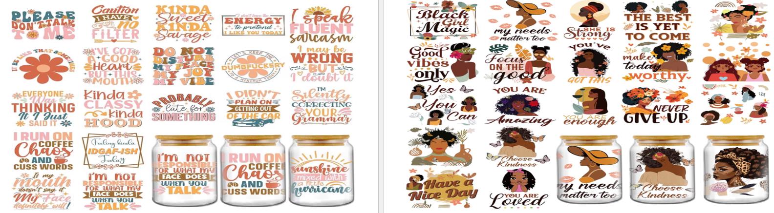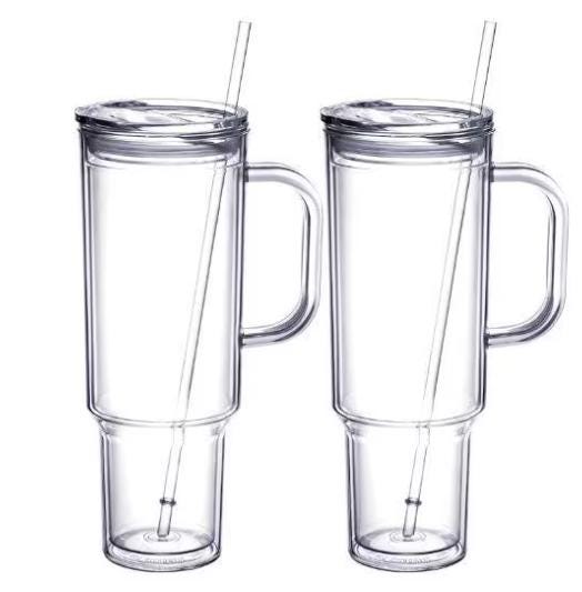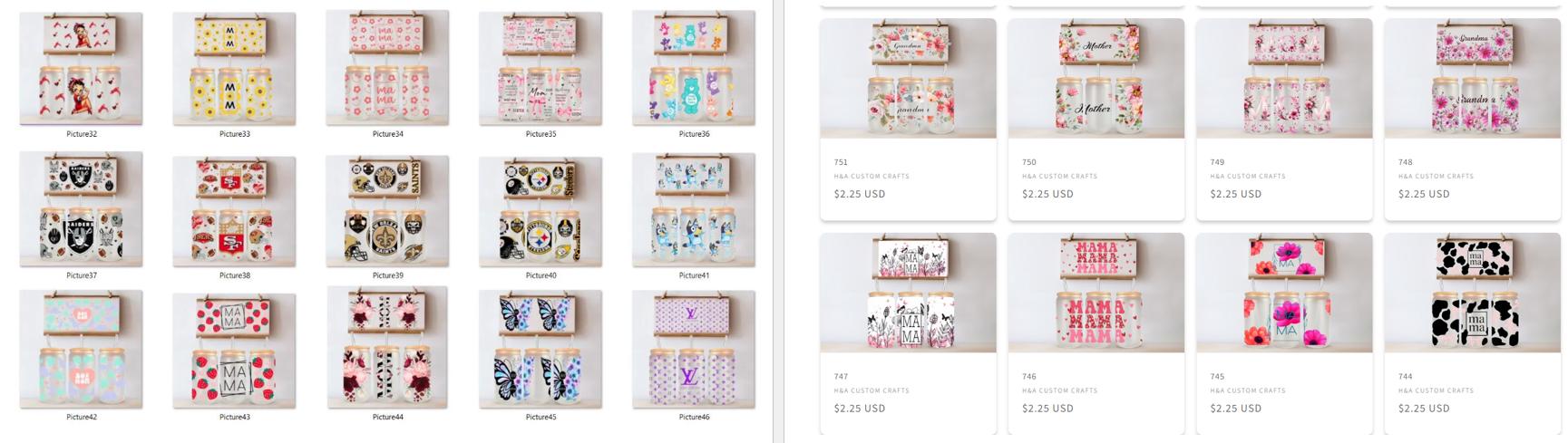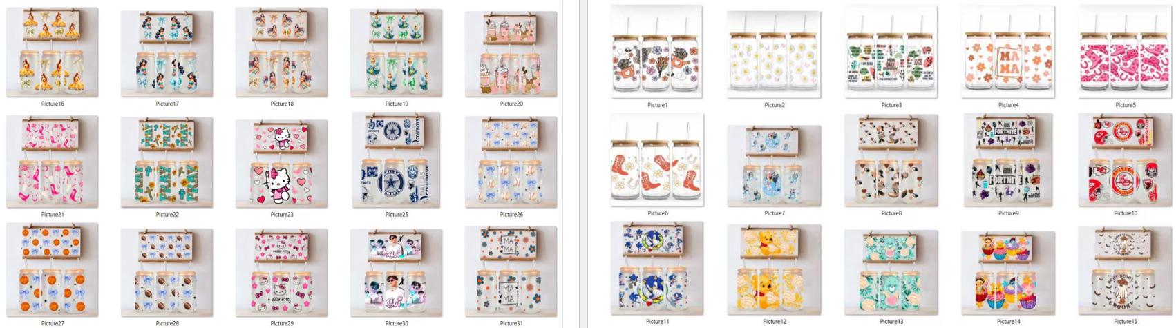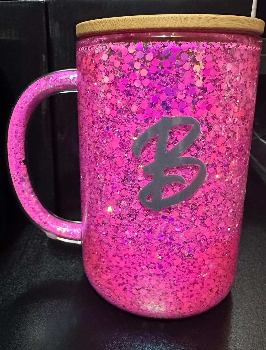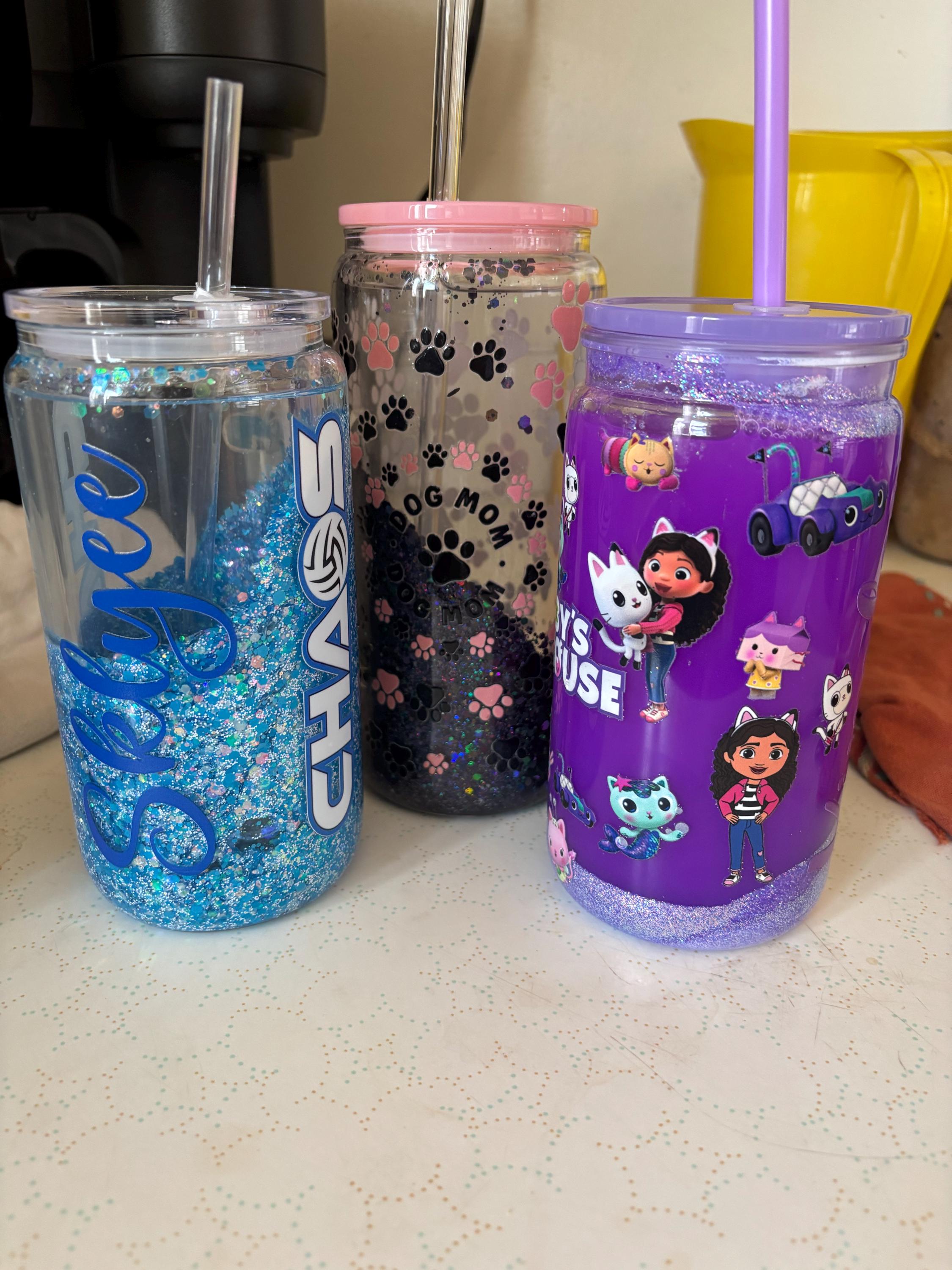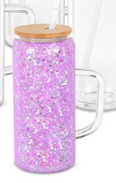 We carry glass and acrylic (plastic) cups in various sizes with and without handles, which includes kids' cups, cups with sublimation only (no glitter) and mason jars. The size cups run from a 3oz shot glass to 40oz tumblers. We also carry fine to chunky glitter.