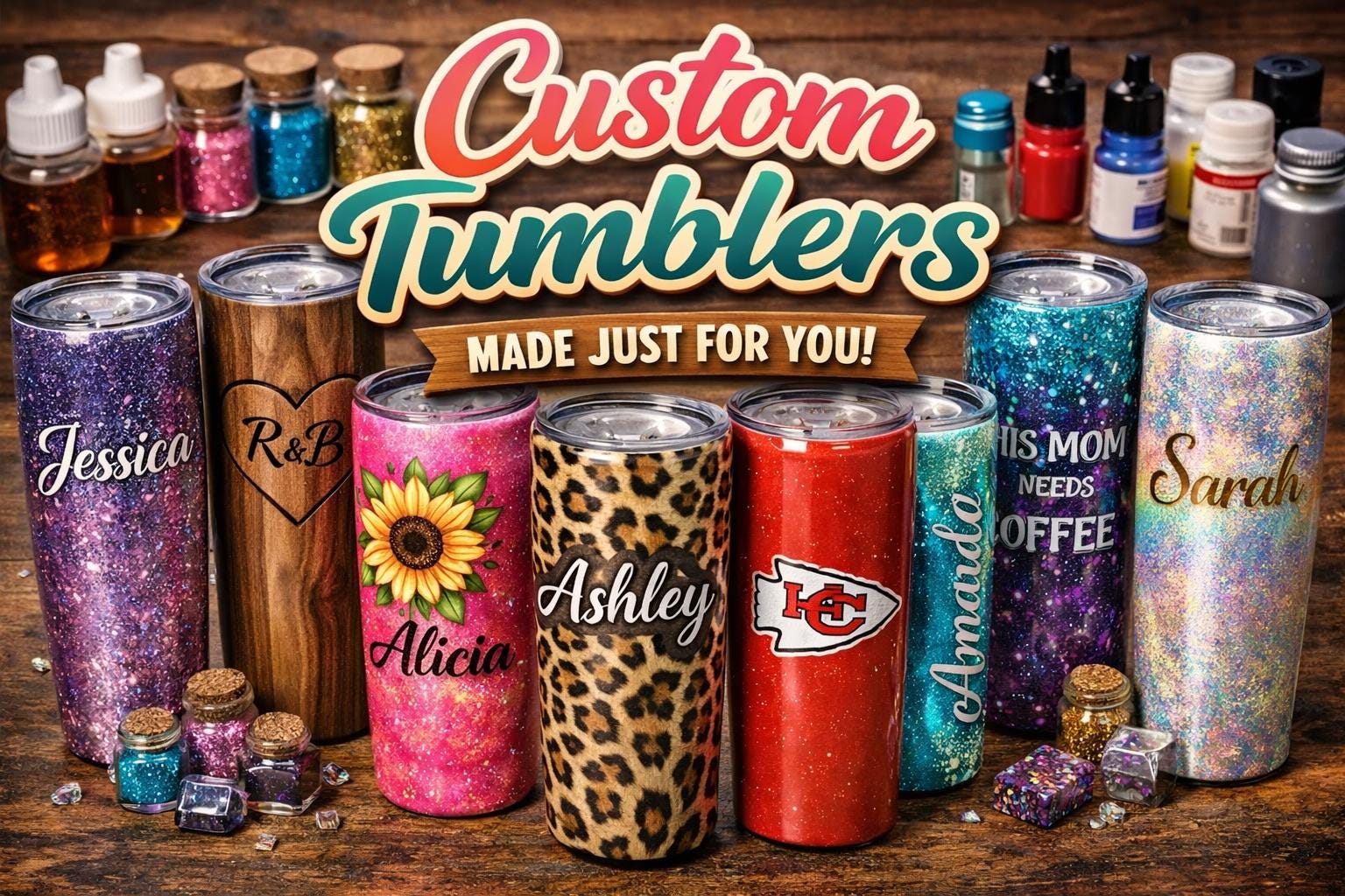 We carry glass and acrylic (plastic) cups in various sizes with and without handles, which includes kids' cups, cups with sublimation only (no glitter) and mason jars. The size cups run from a 3oz shot glass to 40oz tumblers. We also carry fine to chunky glitter.