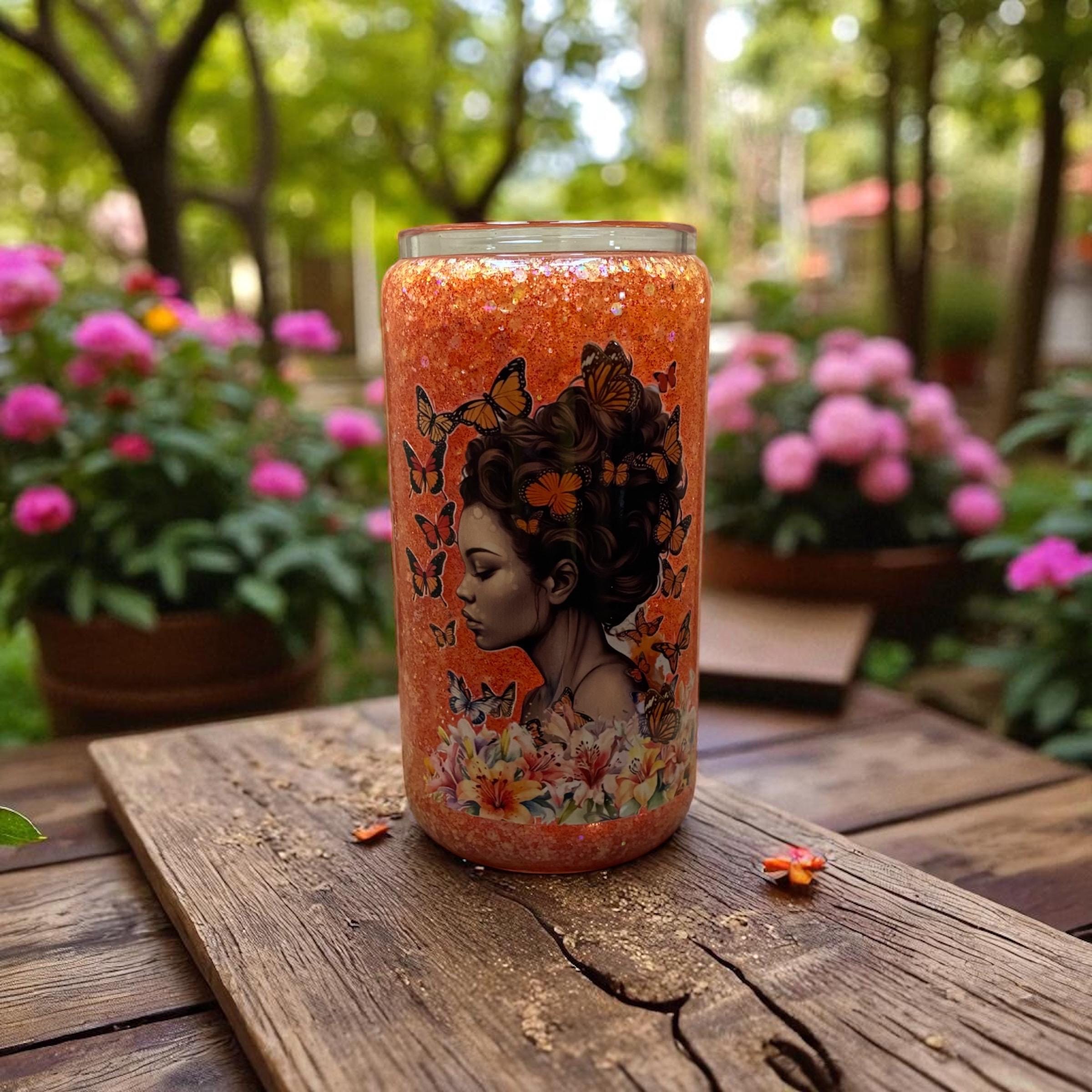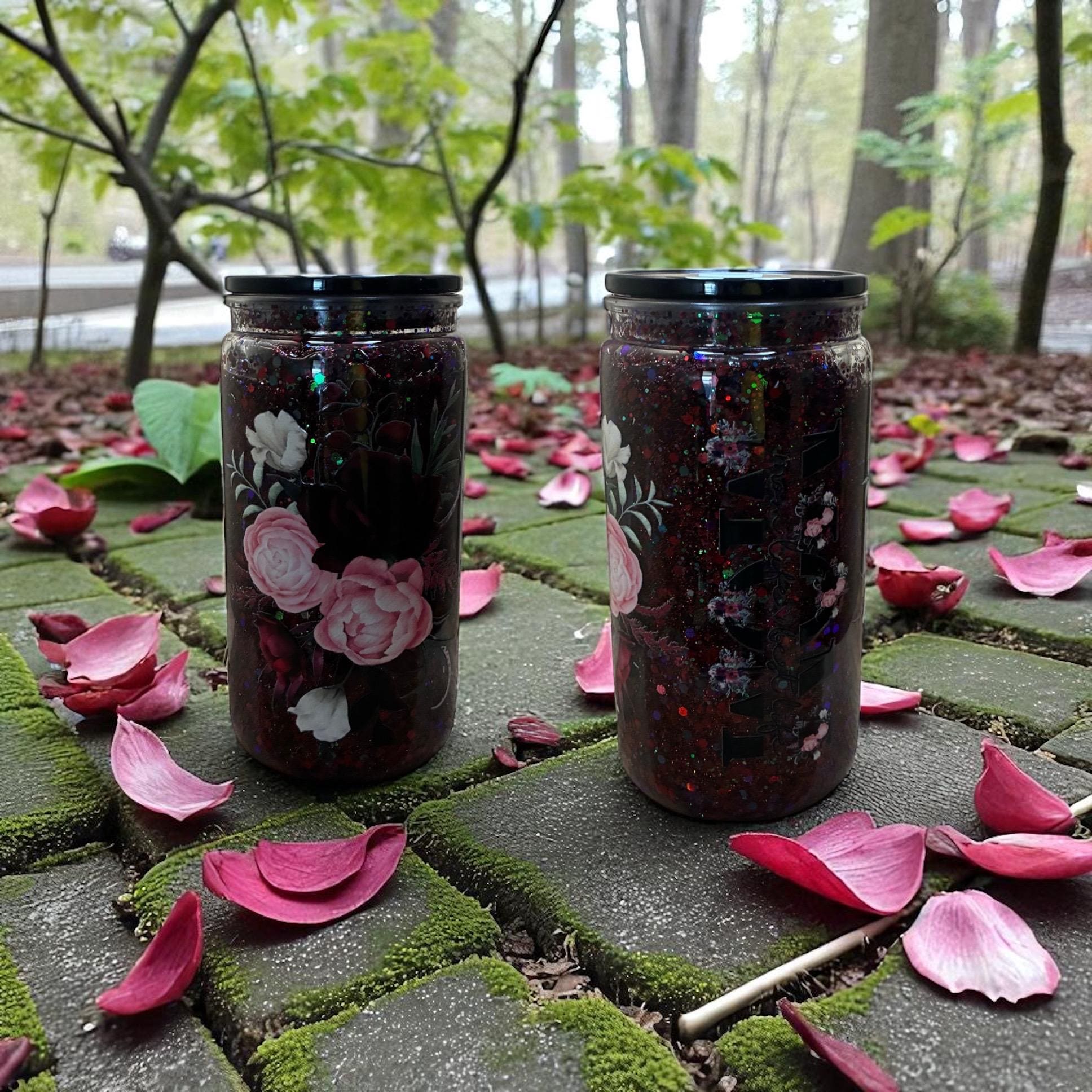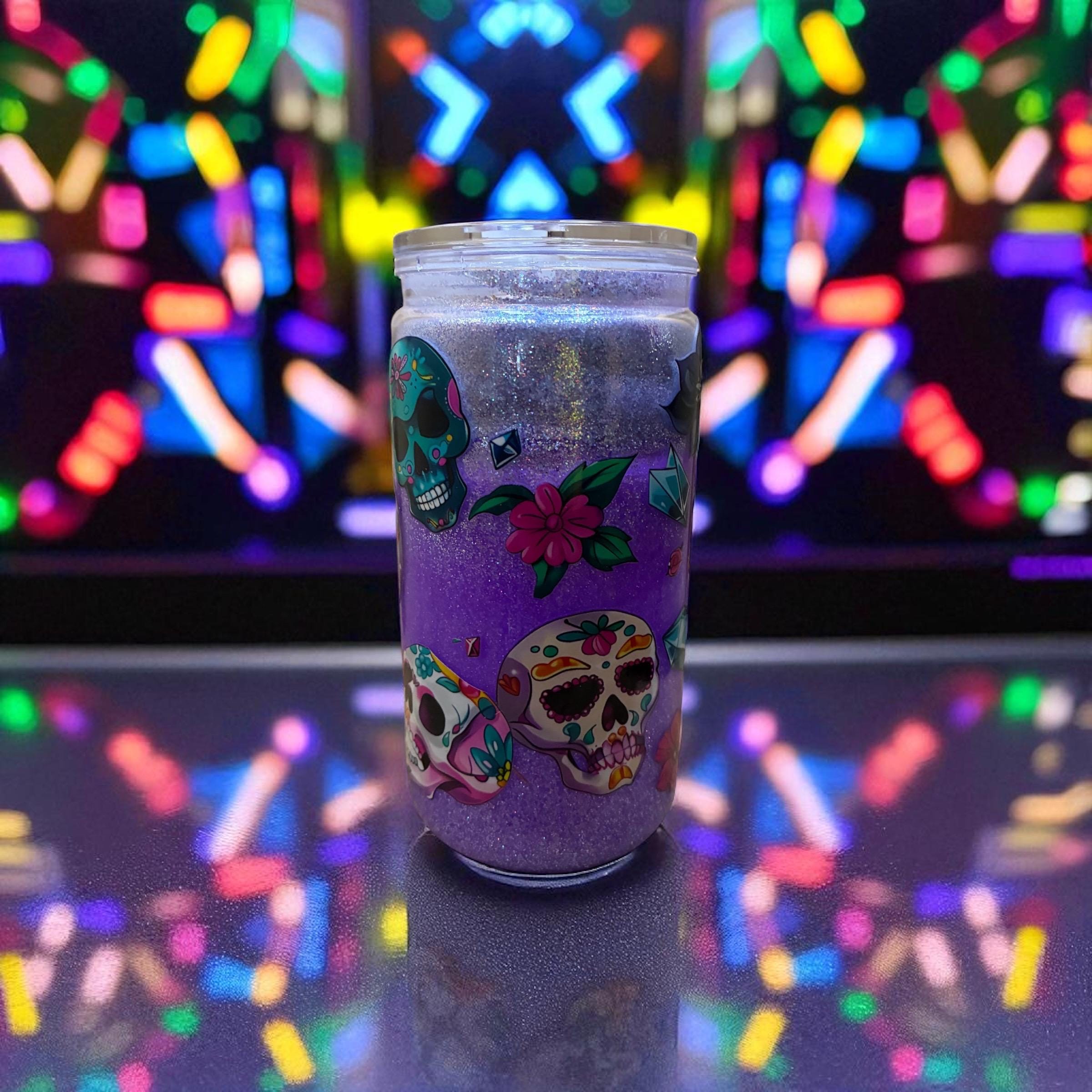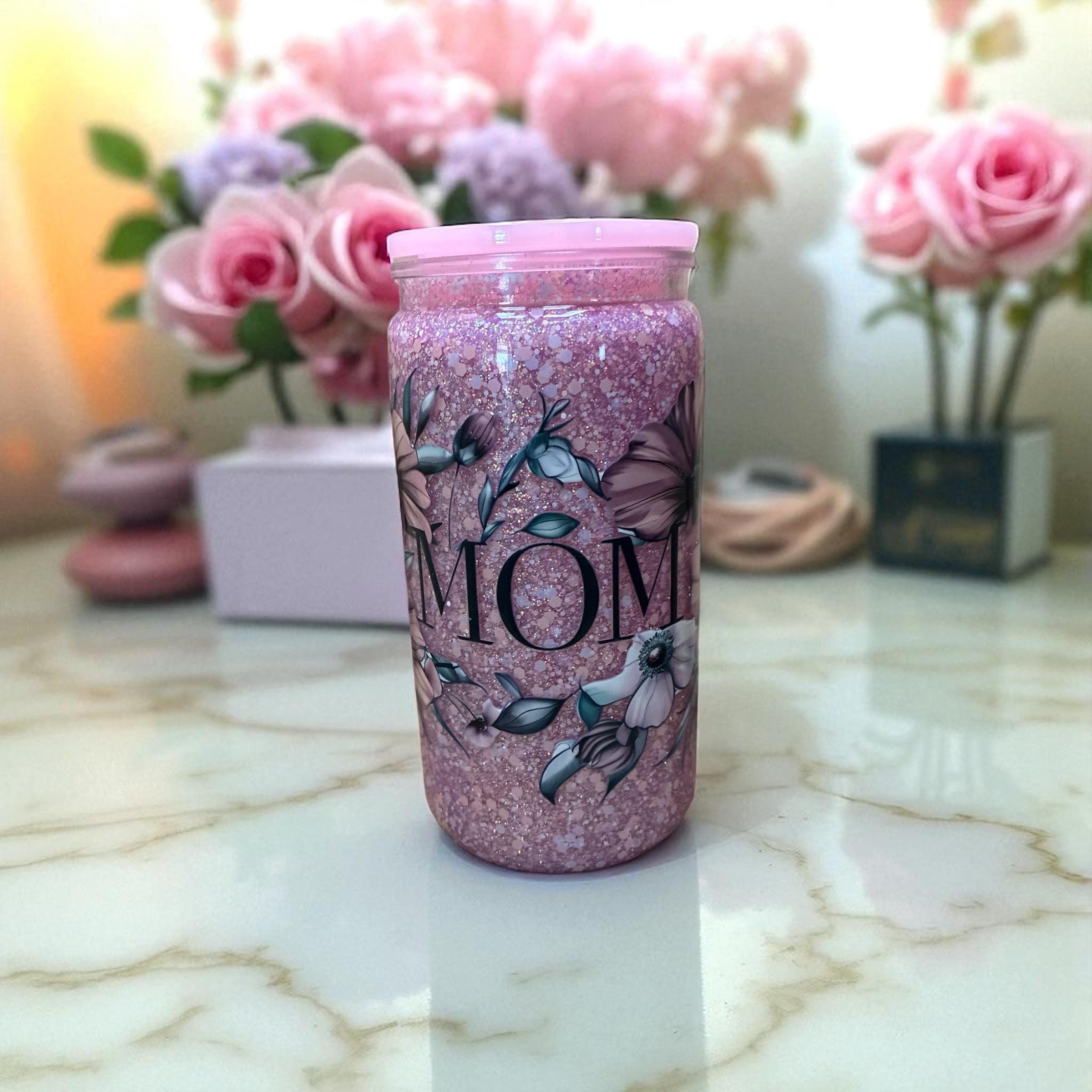 We carry glass and acrylic (plastic) cups in various sizes with and without handles, which includes kids' cups, cups with sublimation only (no glitter) and mason jars. The size cups run from a 3oz shot glass to 40oz tumblers. We also carry fine to chunky glitter.
