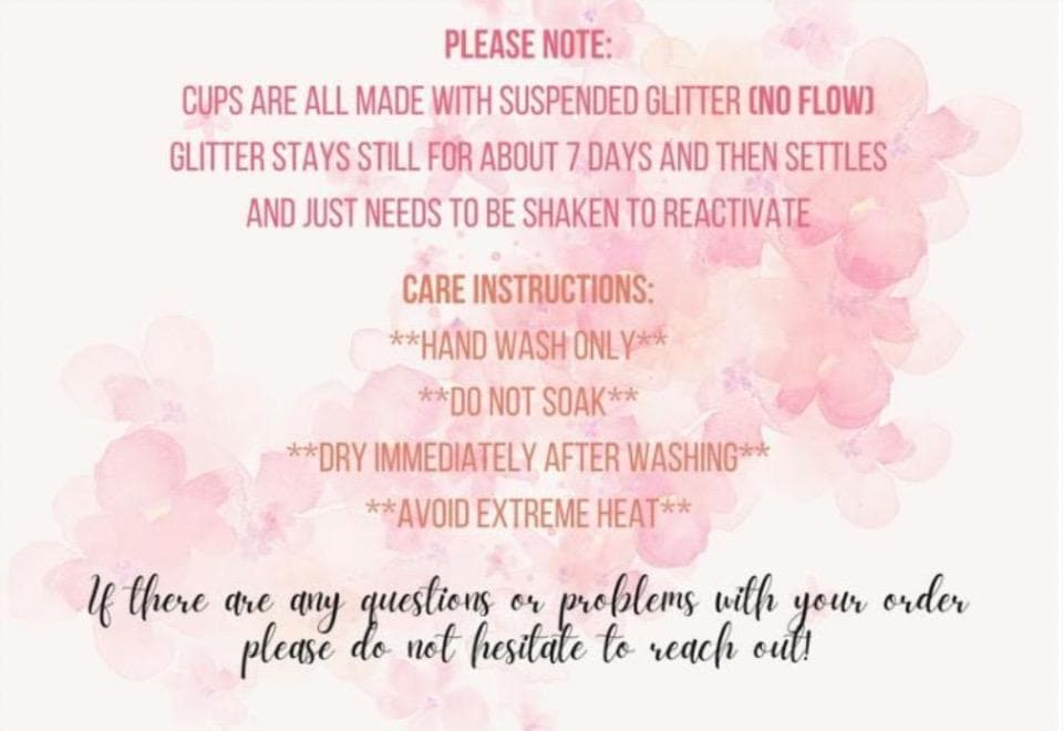 All cups are made with suspended (No Flow) glitter which stays still for a few days and then settles. To restore the glitter throughout the cup, simply shake the cup to reactivate.