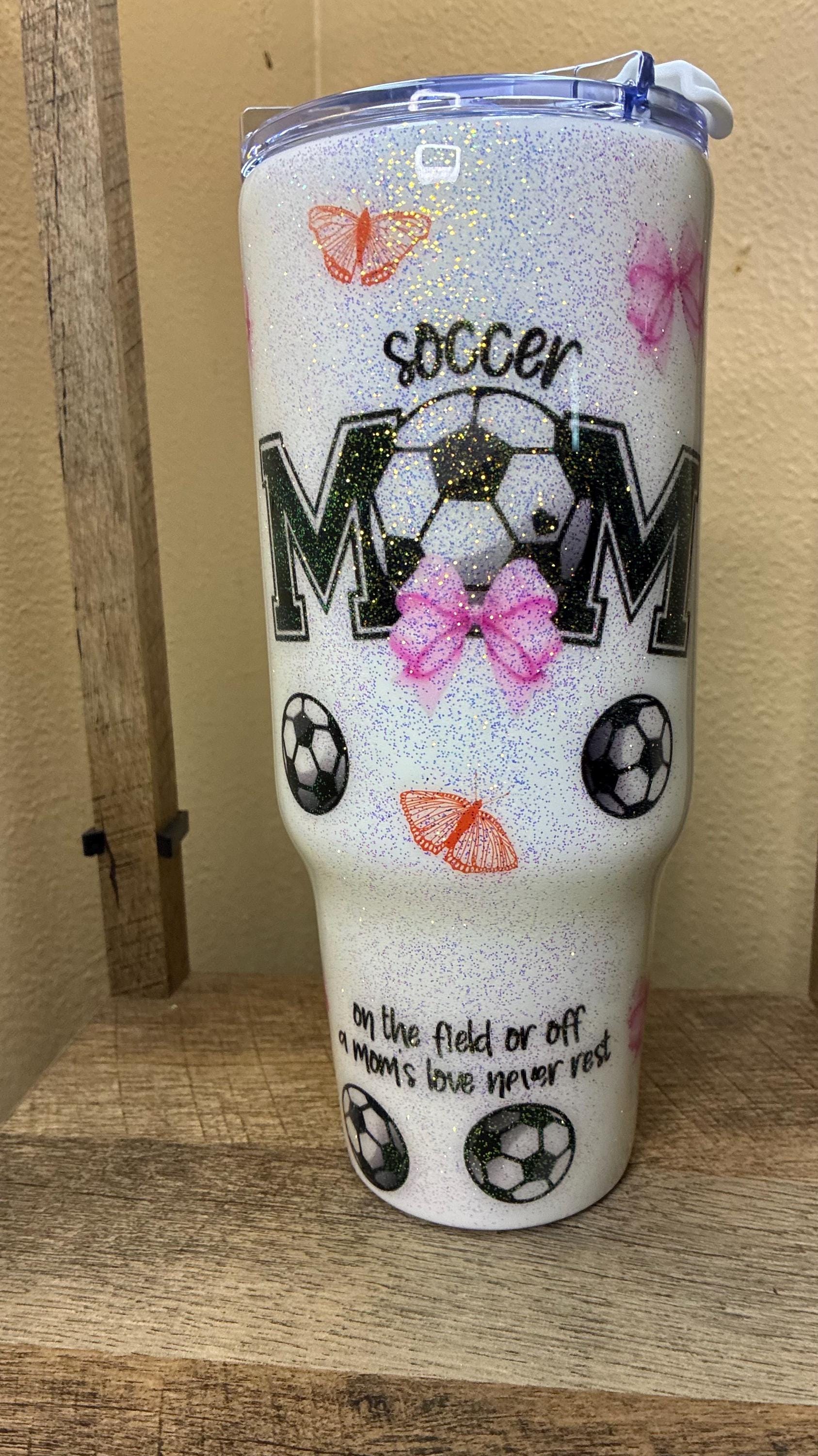 We carry glass and acrylic (plastic) cups in various sizes with and without handles, which includes kids' cups, cups with sublimation only (no glitter) and mason jars. The size cups run from a 3oz shot glass to 40oz tumblers. We also carry fine to chunky glitter.