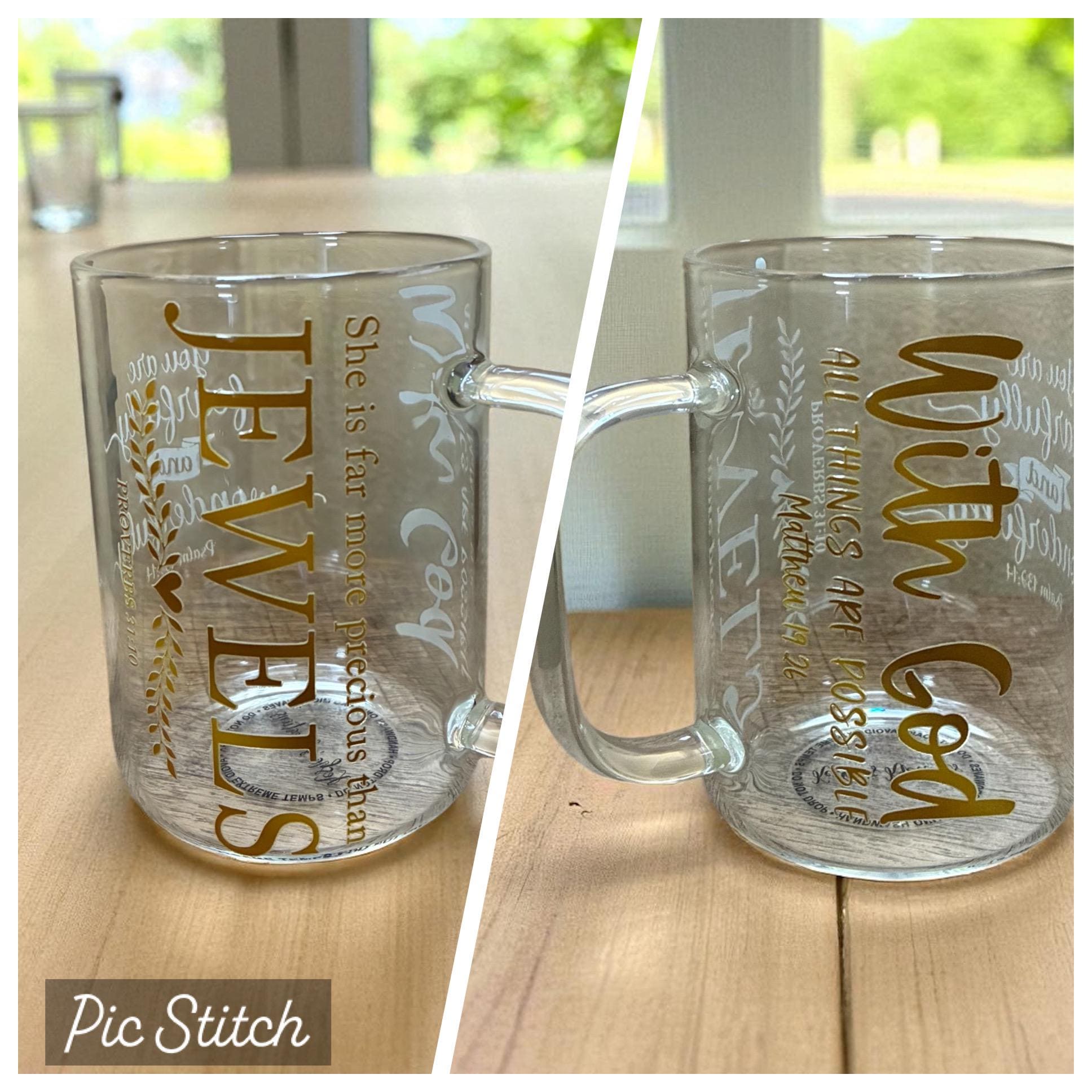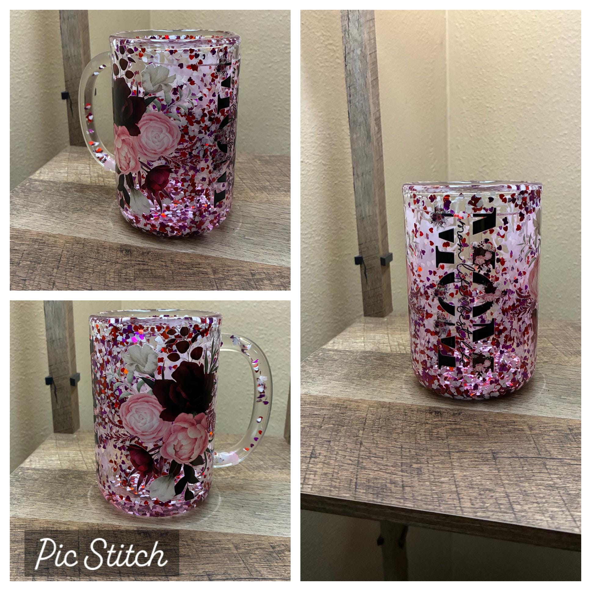 We carry glass and acrylic (plastic) cups in various sizes with and without handles, which includes kids' cups, cups with sublimation only (no glitter) and mason jars. The size cups run from a 3oz shot glass to 40oz tumblers. We also carry fine to chunky glitter.