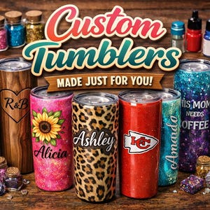 We carry glass and acrylic (plastic) cups in various sizes with and without handles, which includes kids' cups, cups with sublimation only (no glitter) and mason jars. The size cups run from a 3oz shot glass to 40oz tumblers. We also carry fine to chunky glitter.